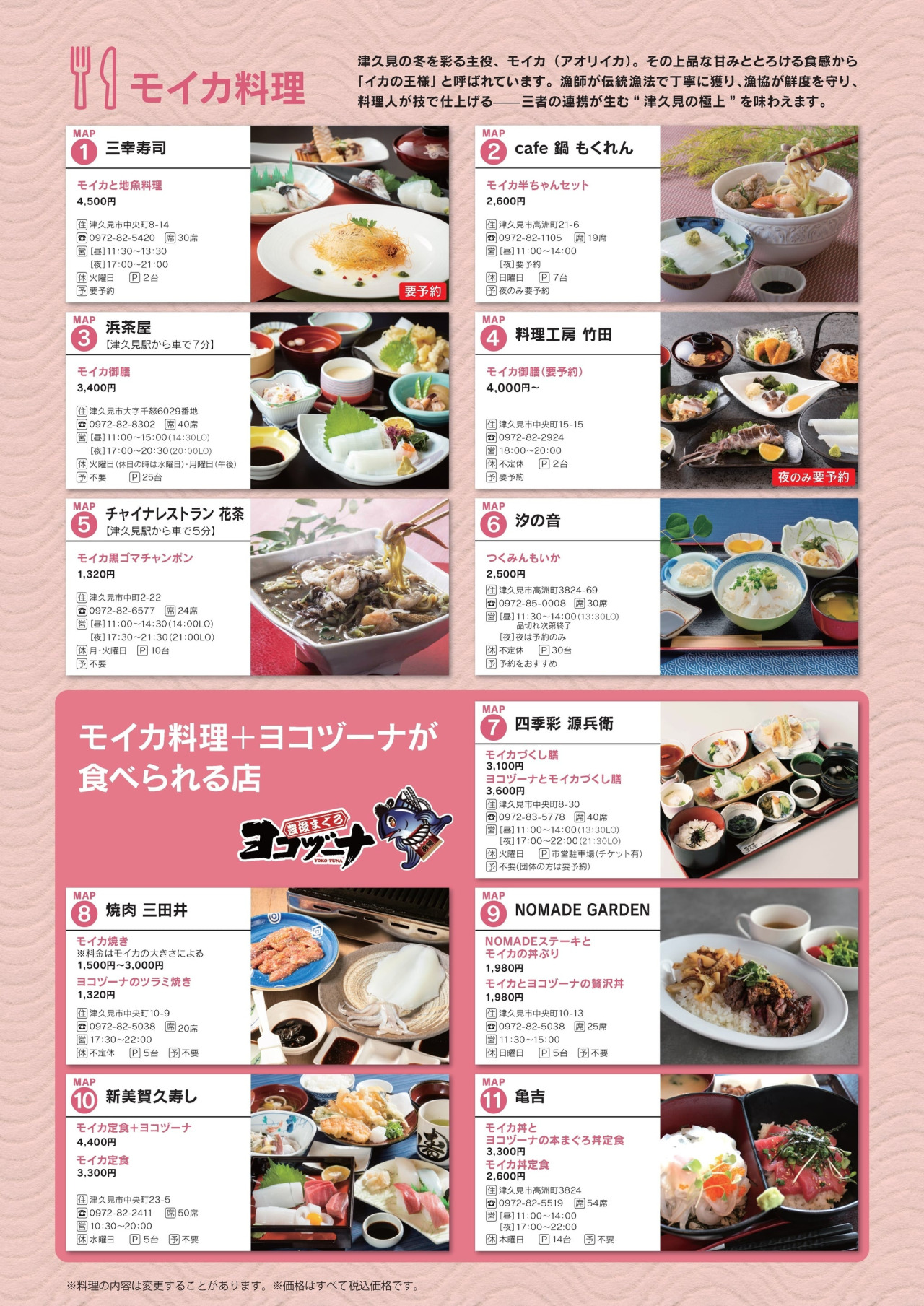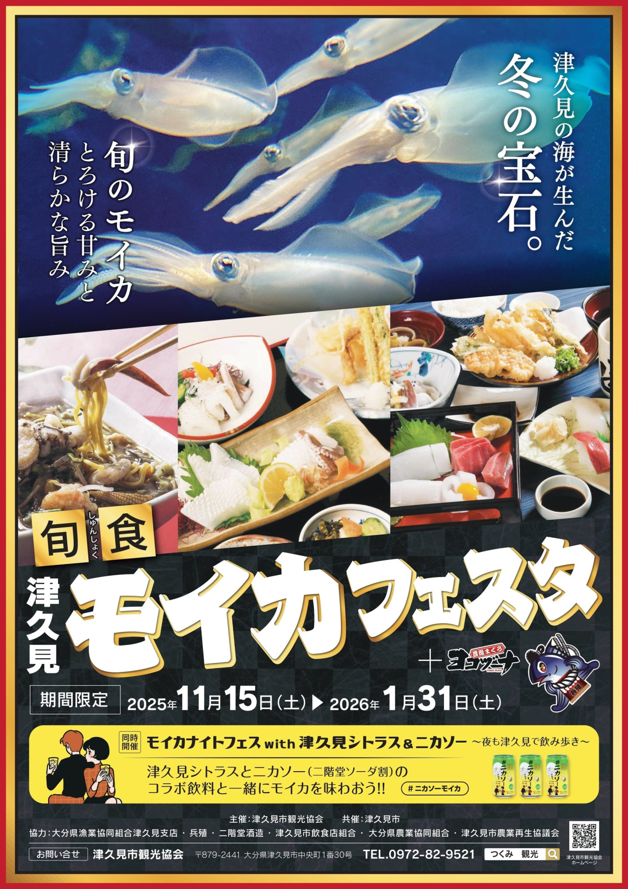 From November 15, 2025 to January 31, 2026, participating restaurants throughout Tsukumi City will offer special dishes featuring moika squid—fresh, in-season bigfin reef squid.