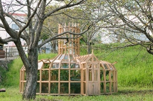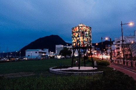 - This is Tom Frueyn's first work in Japan. Created using recycled acrylic waste materials collected within Oita Prefecture, it takes the water tower as its motif. During the day, it glows like stained glass when illuminated by sunlight, casting vividly colored shadows. Then, from sunset until 11:00 PM, its interior is illuminated, lighting up the nighttime streets of Beppu like a vibrant lighthouse.