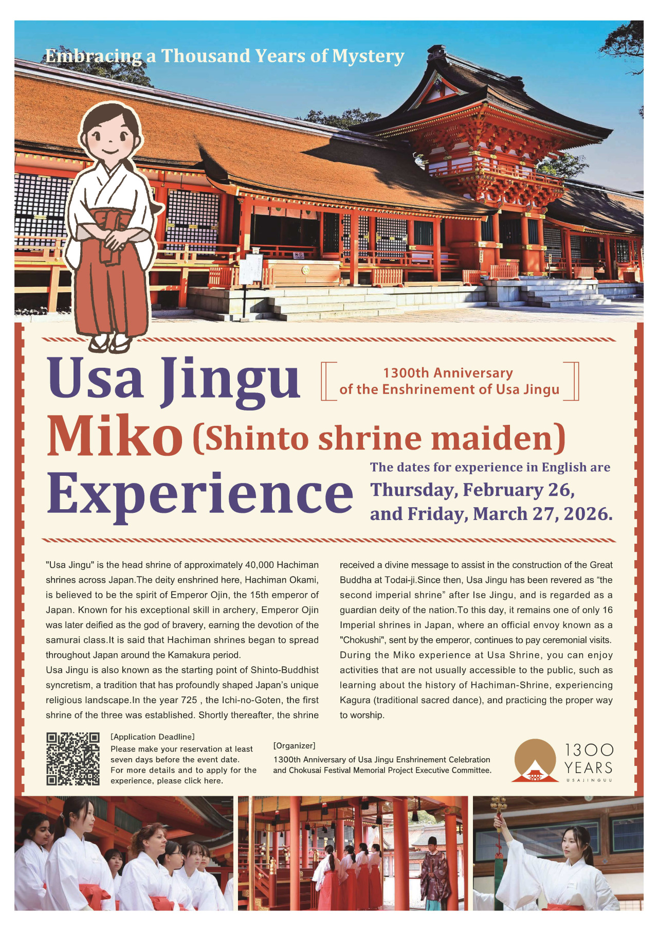 【Now Accepting Participants】Special Commemorative Program for the 1300th Anniversary of the Enshrinement of Usa Jingu: “Miko (Shinto Shrine Maiden) Experience”