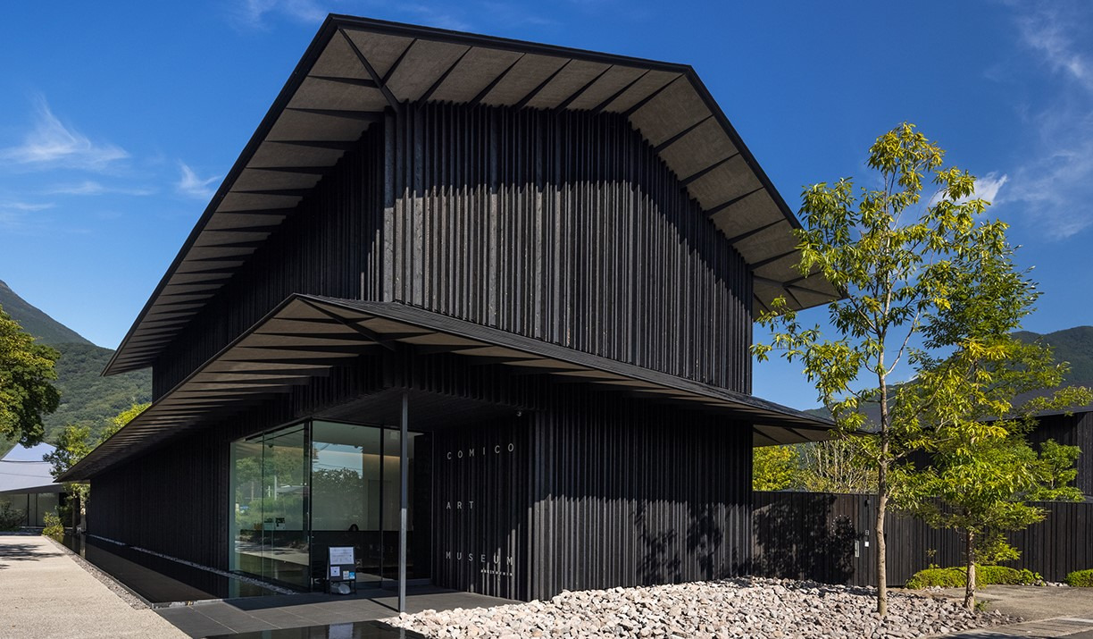 「COMICO ART MUSEUM YUFUIN」位於由布岳山腳下的一處靜謐地帶,融合了享譽全球的現代藝術與建築設計,為遊客帶來特別的鑑賞體驗。這座美術館建築由建築師隈研吾操刀設計,外觀使用「燒杉」(將杉木表面燒烤炭化後呈現的黑色木材)打造,在現代風格中呈現溫暖質感,同時也與由布院的自然景觀和諧相融。館內長期展示草間彌生、奈良美智、村上隆、杉本博司等日本代表性當代藝術家的作品,展品數量豐富。