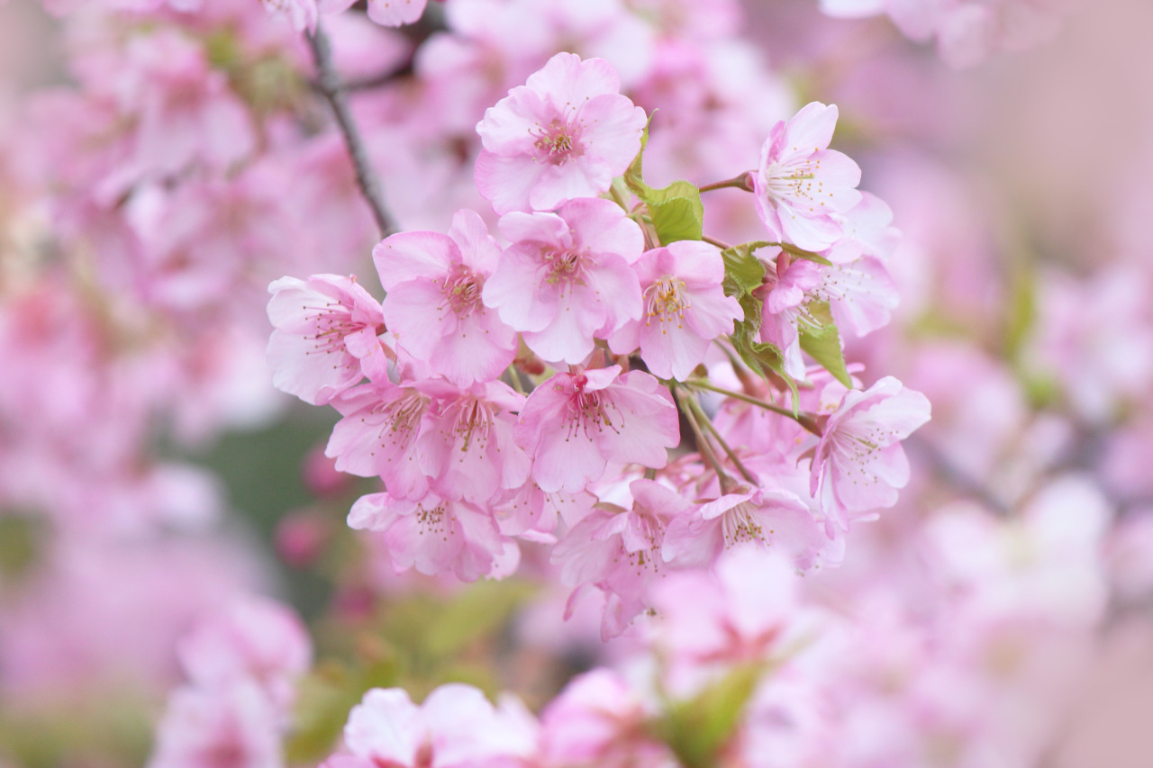 天氣晴朗時,澄澈的藍天與深藍色的大海相互輝映,河津櫻柔和的粉紅色更顯鮮明,交織出令人陶醉的美麗風景。