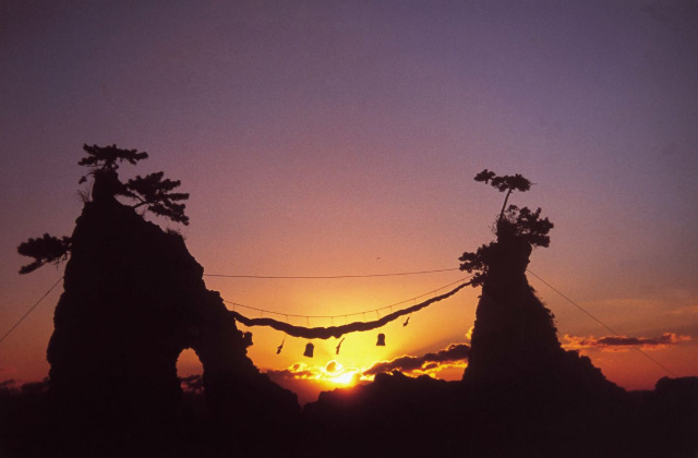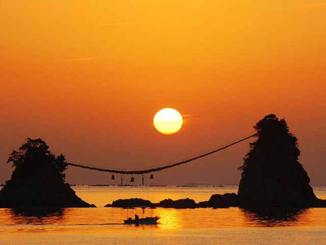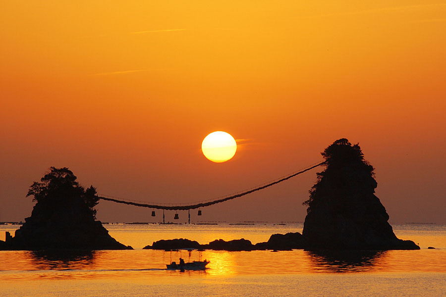 - 這裡以初日之出名勝聞名,同時被認定為「大分遺產」。連結夫妻岩的大注連繩,長約65公尺、重量約2噸、最大直徑約75公分,1994年曾被列入金氏世界紀錄。大注連繩每年在12月第二個星期日,由當地志工重新更換。