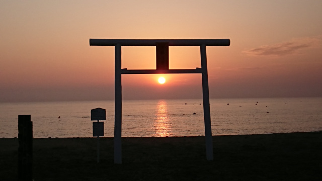 - 這裡擁有美麗的白沙與一排壯觀的老黑松樹,是風光明媚的海岸線。離岸處有一塊被稱為嚴島或市杵島的岩礁,相傳為比賣大神降臨之地,因此設有一座小鳥居。