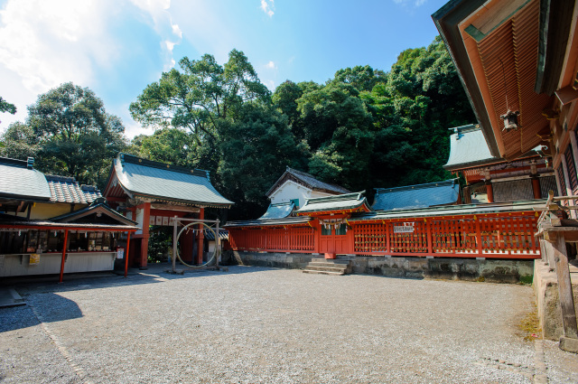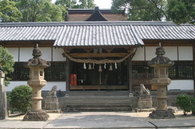 - 祭祀大帶比賣命(神功皇后)、譽田別尊(應神天皇)、比賣大神,是縣內規模數一數二的八幡宮。相傳其起源為680年於靱負郷岩松ヶ峰(天瀨町鞍形尾)顯現的八幡神。境內最古老的樓門建於貞享4年(1687年),拜殿・幣殿・本殿則被認為建於寬政6年(1794年),歷史價值極高。