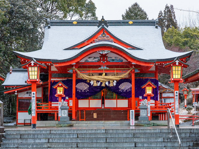 - 位於佐伯市沿岸的神社,以淡粉色可愛的社殿為特色。此處以保佑安產與締結良緣的神明聞名,相傳江戶時代毛利藩的侍女們也會前來參拜。天花板上繪滿色彩鮮豔的畫作,包含草木、海洋相關的自然景致等共80幅,讓人忍不住駐足細細欣賞。