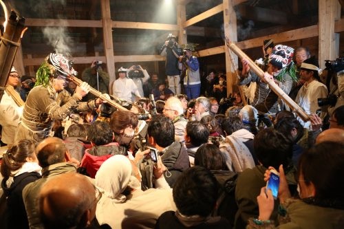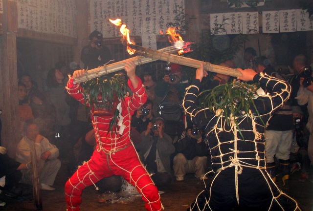 祭典時,鬼所配戴的紅色和黑色面具,分別象徵「火」與「水」,據說正是因為這兩種完全相反的元素調和,和平才會降臨。參與祭典的人們,會先以冰冷刺骨的河水淨身,接著再接受熊熊燃燒的火把火花洗禮。同時受到神道諸神與佛教諸佛的庇佑守護的這場祭典,正是最能體現國東獨有「神佛習合」樣貌的存在。