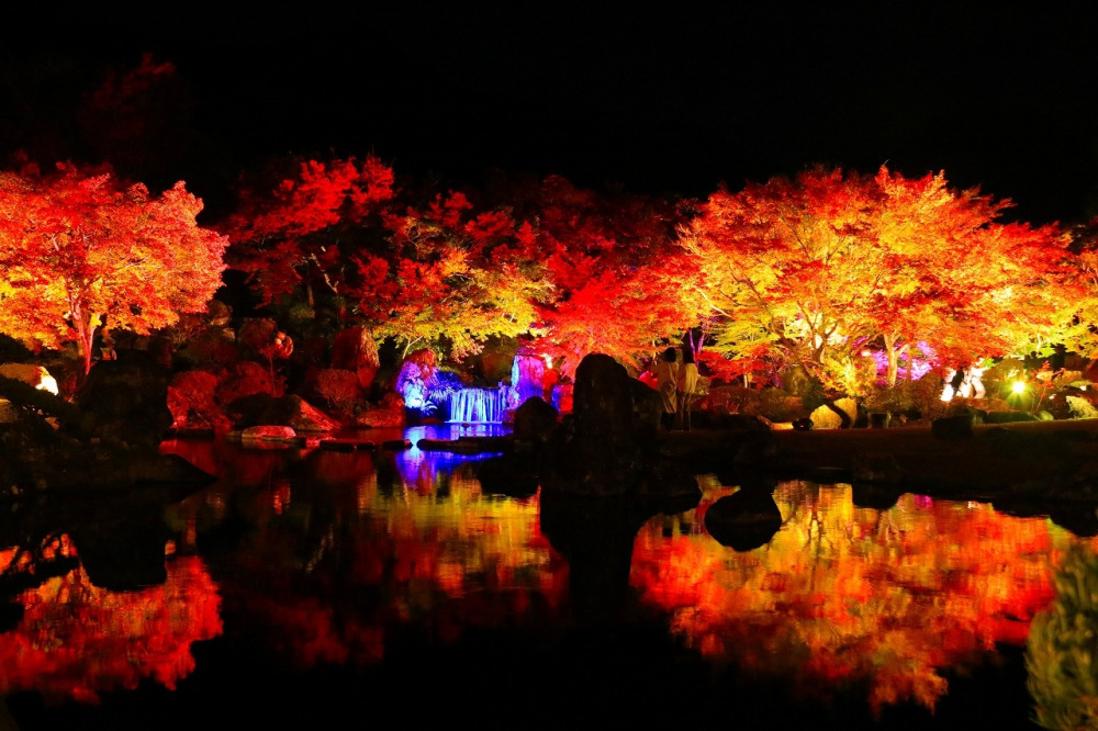 紅葉在燈光映照下更加鮮明,讓人沈浸在秋季夜晚的迷人氛圍中。