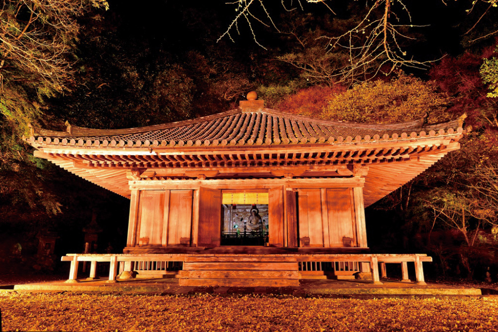 國寶「富貴寺大堂」與紅葉在燈光映照下呈現出夢幻般的景象。